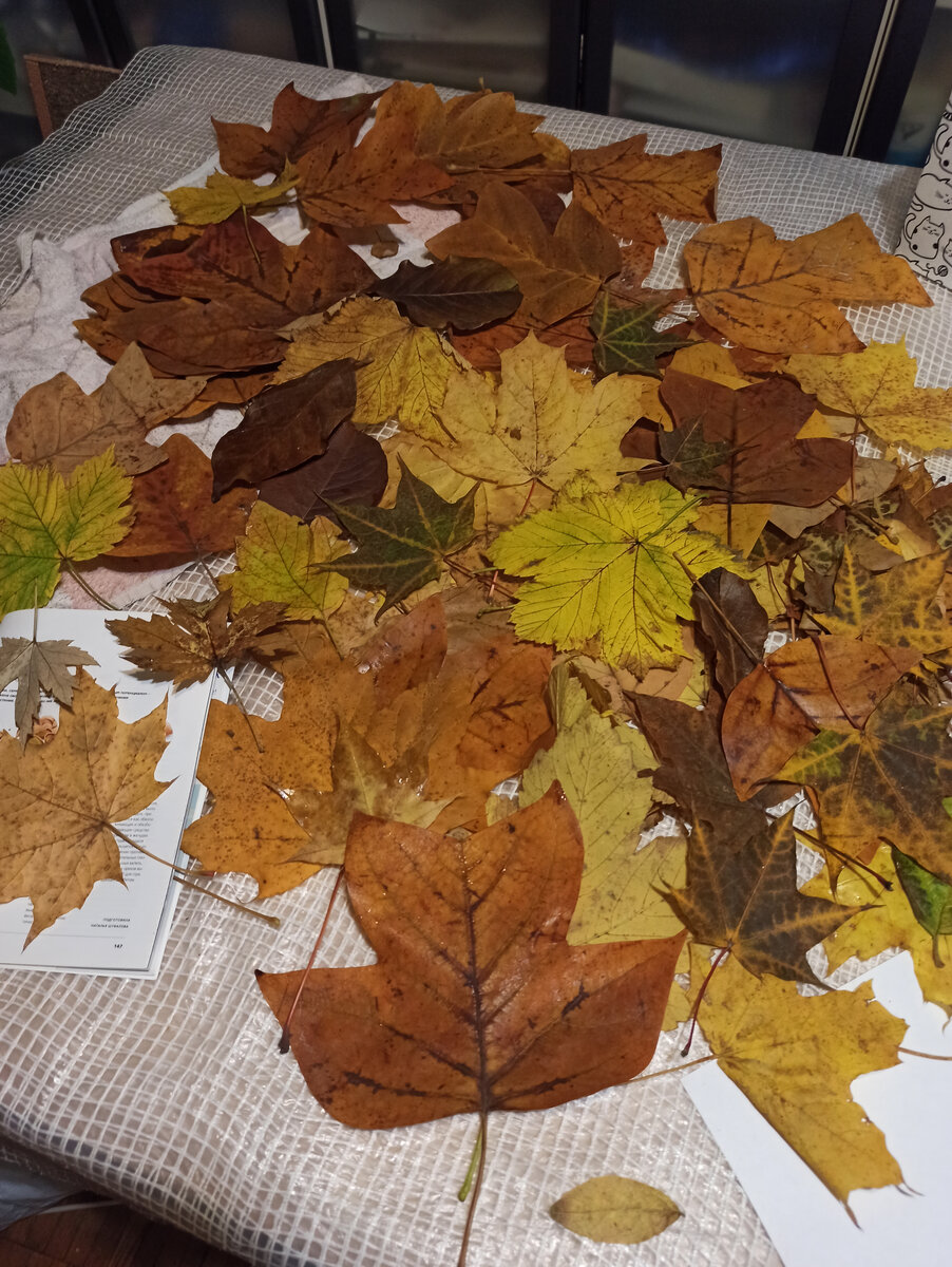 Я создаю красивые шелковые платки с рисунком из листьев. Для этого мне нужны настоящие листья растений даже зимой. Соответственно, я стараюсь летом и осенью собрать листья и высушить их. Лучше всего собирать листья в сухую погоду. Если листья влажные, то стоит их промокнуть от влаги полотенцами (хлопковым или бумажными). Я стараюсь рассортировать листья по размеру и по виду. А затем начинаю раскладывать листья по старым журналам, книгам и газетам. Мелованная бумага в больших глянцевых журналах плохо впитывает влагу, поэтому я добавляю ещё газетные листы. Стопки с книгами и журналами я ставлю поближе к батарее или на неё, так листья внутри высохнут побыстрее. После высыхания листьев, я освобождаю книги и журналы от них, чтобы положить в эти книги сушить новую партию листвы, а высохшие складываю в картонные коробки в несколько слоёв, переслаивая газетами. Маленькие листочки складываю в небольшие пластиковые контейнеры или в маленькие коробочки. Можно рассортировать листья по ви