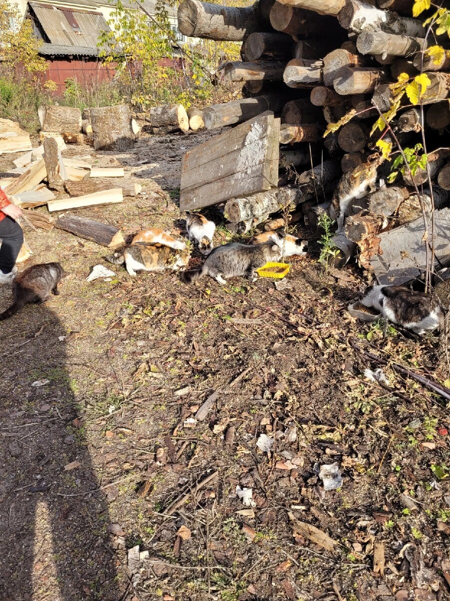 Этой осенью все изменилось в здании, которое отапливает местный Дом Культуры и Дом Милосердия, по нашему кочегарка. Сменились работники. Заделаны все лазейки, где хвостики заходили туда. Под бревнами погибли некоторые хвостики. С каждым днем все тяжелее морально ходить к ним. Все хвостики мёрзнут, сырые. Летом было проще им. Мы каждый день ходим кормить их. Теперь не покидает мысль, ну зачем, когда то давно мы их выпустили обратно. Все равно они под нашим крылом, под крылом КотоБлога. Наталья так же покупает им корм, обработки и лакомства. Так же болеющих мы ловим и лечим. Зачем выпускала? Не знаю. Наверное тогда, больше года или уже двух, я просто хотела их стерилить и все. А теперь проблема поймать их🤦 Да и куда ловить тоже неизвестно,у самих пока бардак и хаос в КотоДоме. Среди них котик Вася, кастрирован, ему тяжелее всех, его лупят все коты. Он быстро поест и убегает. Мы даже как то пытались его поймать прошлый год, но увы. Нашла фото 2020 года, на фото есть и Алиска, котору