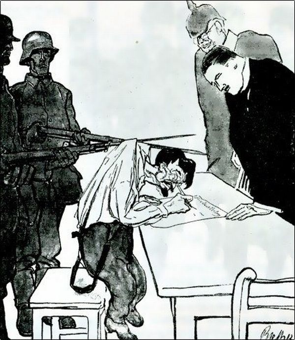Вообще, историю Бреста можно изложить в таких картинках. Это немецкая карикатура. Так Брестский мир выглядел в момент заключения, в марте 1918 года. Поддев штыком за шиворот, германские солдаты заставляют тов. Троцкого подписать кабальные условия Брестского мира, продиктованные Берлином.