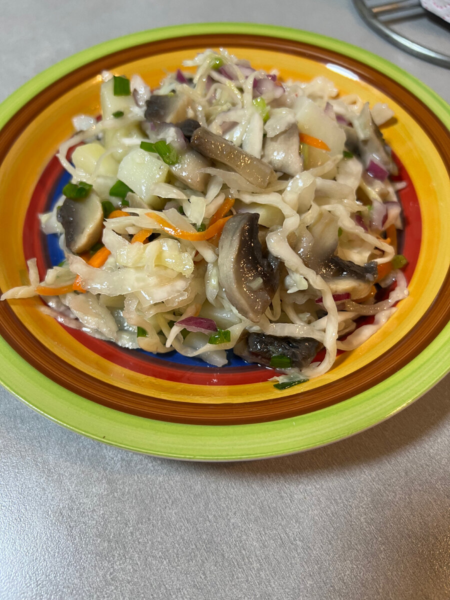 Зимой все чаще хочется чего-то квашеного или соленого, сегодня предлагаю приготовить вкусный и простой салат из квашеный квашеной капусты. Составляющие этого салата простые, салат выходит недорогим, самое тяжелое в приготовлении данного салата - это дождаться пока отварятся грибы и картофель. Моя семья осталась в восторге от такого салатика, и попросила приготовить еще! Ингредиенты: Приготовление: В салатник выкладываем квашеную капусту. Если Вы квасите капусту сами, то это здорово, если нет, то берем покупную. Красный лук нарезаем кубиком. Можно взять обычный репчатый лук. Отварной картофель нарезаем произвольным кубиком, добавляем к капусте с луком. Шампиньоны чистим, затем заливаем горячей водой, и варим 10-15 минут. Остывшие грибы нарезаем пластинками. Мелко нарезать не нужно. Зеленый лук нарезать, добавить с салатник. Посолить и добавить растительное масло по вкусу. Все хорошо перемешать. Очень вкусный салат готов! Приятного аппетита! Готовьте с удовольствием! Буду рада если подп