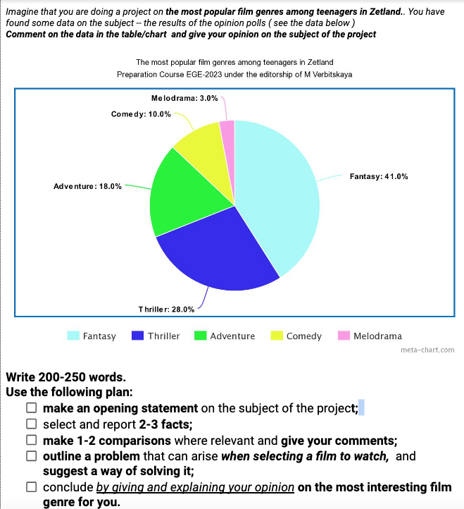 I hope it will help you get your creative juices flowing. ANSWER: It is common for teenagers to have different preferences for films genres. Currently working on a project on the topic of the most popular film genres among teenagers in Zetland, I have found valid contemporary statistics based on the results of surveys. I will analyse the data in the following essay. The pie chart represents a relative popularity of five film genres preferred by young people, shown in percentages. I tend to highlight the two important findings of the research. First, the majority of respondents (41%) pointed out fantasy films as their most favourite genres. Second, the least number of the surveyed, just 3%, like melodrama. Looking at the data more closely, I can see that the fantasy films’ rate (41% ) is twice as high as that of adventure films whose figure is 18% , and fourfold as big as the figure of comedy movies (10