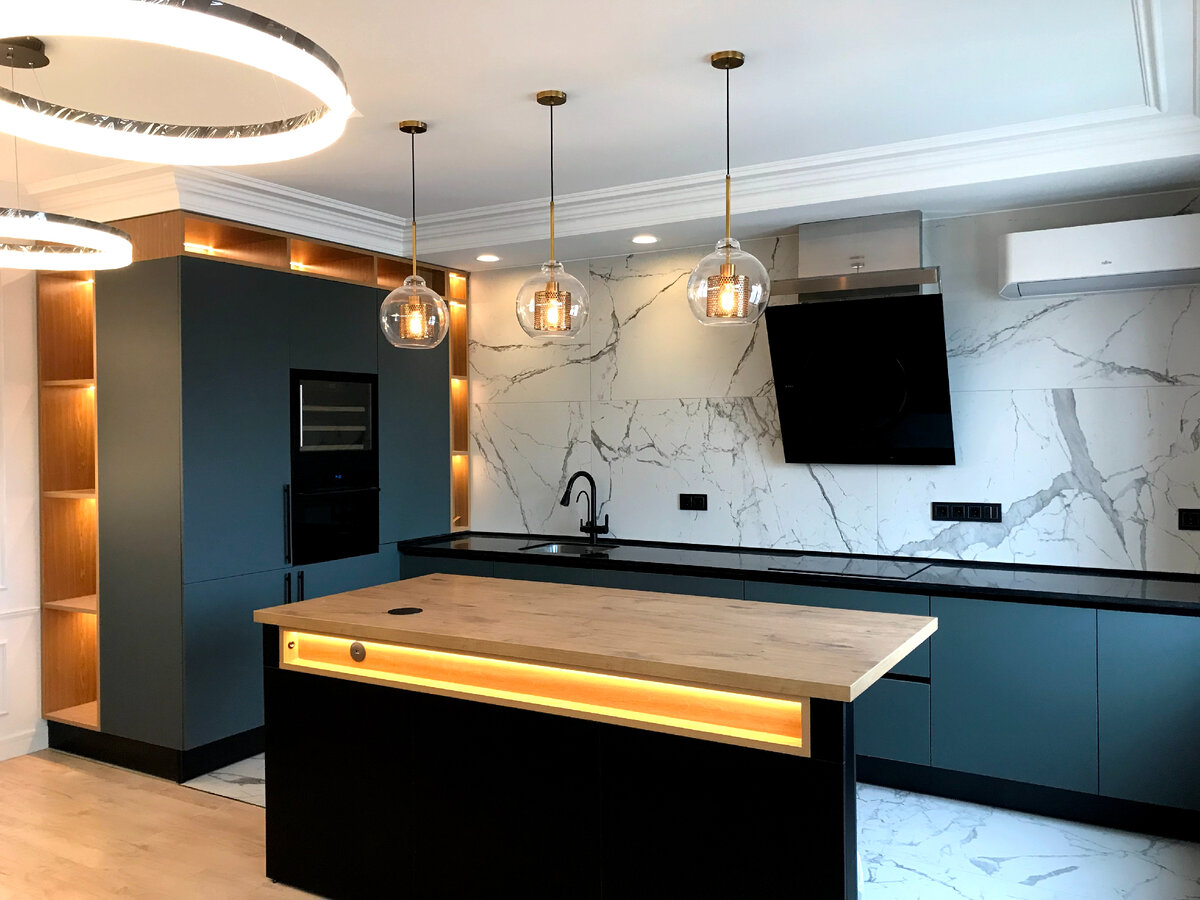 Сегодня хочу сделать обзор проекта 2020 года, который, как показало время, не утратил актуальности, т.к. был правильно выстроен концептуально. Объект – кухня-гостиная в жилом комплексе г.Екатеринбурга. Задачей дизайнера было создание просторного, наполненного воздухом интерьера, при этом с применением довольно цветовой темной гаммы и глянцевых черных акцентов. Дизайнер Анна Любимцева с блеском справилась с решением столь разнонаправленной задачи. Кухня без верхних модулей над столешницей. Столешница из черного блестящего камня с еле видной мраморной текстурой (M-708 A Deep Water Grandex). Фасады основной части кухни из итальянского пластика Fenix 0750 Verde Comodo. Этот материал просто волшебный: он по настоящему благороден, очень матовый, невероятного оттенка, который меняет цвет в зависимости от освещения. Но помимо этого, материал обладает способностью «самозаживления», небольшие царапины затягиваются при воздействии влажного горячего воздуха, ну, или просто при проглаживании утю