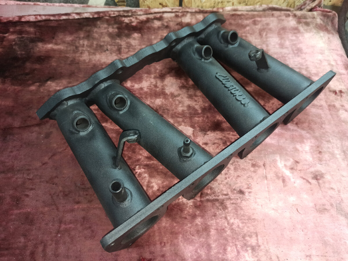 Перед вами его более бюджетная альтернатива. Это сварной коллектор от КлубТурбо. Длина раннеров около 200 мм. Диаметр отверстий во фланце к ГБЦ около 35 мм. Фланцы к дросселям чуть больше 40мм. Ньюансы: