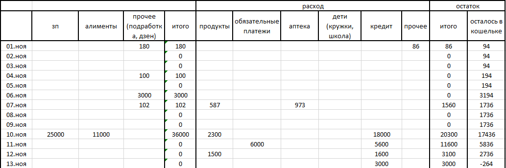Всем привет! В пятницу нас выписали, все выходные активно долечивали сопли, и никуда не ходили. Я тут загорелась идеей завести себе планер или как его еще называют Bullet Journal. В Bullet Journal нет каких‑то жёстких шаблонов, заранее размеченных страниц и правил. Надо будет залезть в недра моих блокнотов и подобрать подходящий. Начну вести, если затянет и не заброшу то с нового года начну новый красивый) а может продолжу и этот. 10 ноября получила зарплату и пришли алименты. Оплатила сразу кредиты, кварплату. В выходные пополнили с детьми запасы продуктов. По кредитам осталось в этом месяце внести еще 11000, не знаю смогу найти или нет, но посмотрим. Сегодня детки пошли в школу, а я на работу. На сегодняшний день наши финансы выглядят так. Эту неделю продержимся, а там придут больничные и аванс. Из обязательных платежей осталось оплатить кружки детям, электроэнергию и интернет. Вот такие у нас дела. Спасибо что остаетесь с нами.