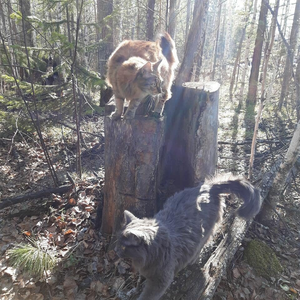 После зимы, как подсохло, вывезли кошек на участок погулять. Усатые довольны 🐈🐈⬛😸