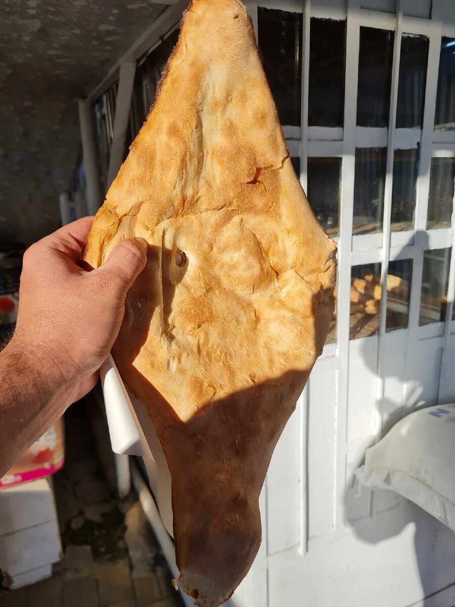 В Грузии хлеб не покупают в супермаркетах. Ну, покупают, конечно, но в основном туристы. Тут принято покупать шоти. Это такая грузинская лепёшка, котора печётся в каменной круглой печи. Прилепляется к стенке изнутри и печётся. По технологиям, как и сотни лет назад. Ну, думаю, сегодня дрожжи добавляют вместо закваски. И мука более рафинированная, без отрубей. Везде, от небольших посёлков до центра Тбилиси можно встретить такие вот небольшие ларёчки, где с утра до позднего вечера выпекают шоти. Всегда горячие, всегда свежие. Убирать в пакет считается кощунством. Да и расплавиться может – прямо из печи же! Потому готовую лепёшку прихватывуют маленькой бумажкой и так и отдают довольному покупателю. А тот прямо не отходя от кассы начинает её надкусывать. Горячая хрустящая корочка – это ведь самое вкусное! А когда остывает и, не дай бог, немного черствеет – то становится обычным магазинным хлебом. До этого лучше не доводить, конечно!