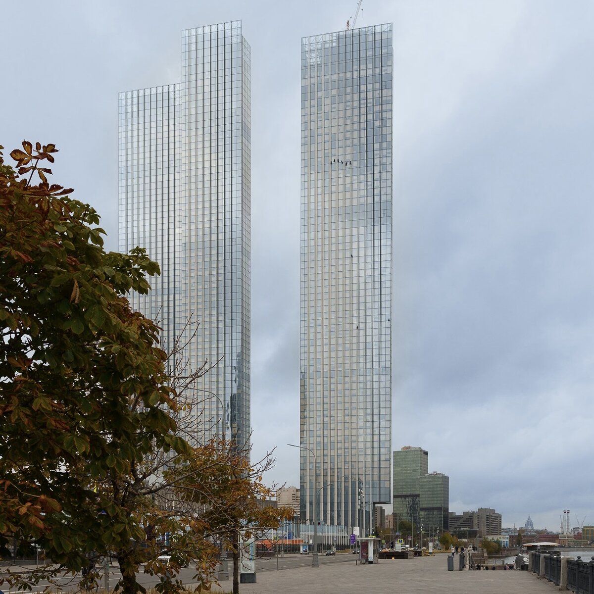 Интересный факт: площадь стеклянных фасадов башен составляет более 115 000 кв. м. Фасадные панели хранились на этажах, начиная с момента монтажа основного объема. Установку фасадных панелей производили башенным краном на выносные площадки, с которых они вывешивались для монтажа мобильным краном, работающим по периметру здания одного этажа.