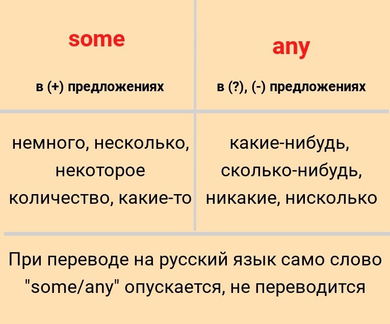 У слов some и any имеется несколько разных способов использования. Но, на начальном этапе изучения языка, нет смысла досконально изучать все нюансы их употребления, потому что это ничего не даст. Помните, что слона нужно есть по кусочкам!