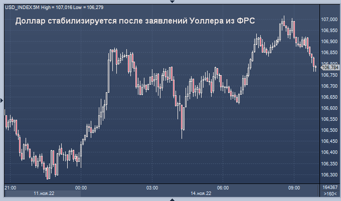 Рынок снова стал слишком беспечным, что вредит планомерной работе ФРС по снижению инфляции, поэтому чиновники пытаются вернуть его в русло разумности График индекса доллара интервалами в 5 минут Доллар США стабилизировался в понедельник после того, как замглавы Федеральной резервной системы Кристофер Уоллер заявил, что центральный банк не смягчает свою борьбу с инфляцией, что заставило некоторых инвесторов подумать, что резкая распродажа на прошлой неделе, вероятно, была преувеличена. Немного более прохладные, чем ожидалось, данные по инфляции в четверг повергли доллар в штопор, индекс доллара снизился на 4% за неделю, что стало худшей неделей более чем за два с половиной года. Индекс доллара, который измеряет курс доллара по отношению к корзине из шести валют, включающей иену, евро и фунт стерлингов, вырос на 0,234% до 106,960 в ходе азиатских торгов в понедельник, поднявшись с почти трехмесячного минимума 106,27, которого он достиг в пятницу. Мировые акции, тем временем, взлетели, по