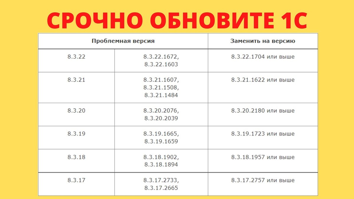 Фирма "1С" доводит до сведения пользователей и партнеров, что в версиях платформы "1С:Предприятие" 8.3.22.1672, 8.3.22.1603, 8.3.21.1607, 8.3.21.1508, 8.3.21.1484, 8.3.20.2076, 8.3.20.2039, 8.3.19.1665, 8.3.19.1659, 8.3.18.1902, 8.3.18.1894, 8.3.17.2733, 8.3.17.2665 обнаружена критическая проблема, которая может привести к закрытию приложения в начале работы с программой. Данная проблема НЕ проявляется: Изменение внешних условий 15.11.2022 может существенно повысить вероятность проявления данной проблемы – предполагается, что многие пользователи перечисленных версий завтра не смогут работать. Проблема не приводит к потере данных пользователей. В связи с этим пользователям перечисленных выше версий рекомендуется до начала рабочего дня 15.11.2022 обновить платформу "1С:Предприятие", как указано в таблице: При данной замене функциональность версий не меняется. При замене указанных версий платформы все накопленные в информационной базе данные будут сохранены. Версии с исправлениями станут