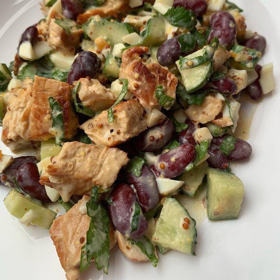 Салат с фасолью, индейкой и огурцом 📖 Ингредиенты: - Филе индейки - 200 г. • Огурец свежий - 2 шт. - Фасоль красная консервированная - 100 г. - Яйцо - 2 шт. - Кинза или петрушка - Соль - по вкусу Для соуса: - Йогурт греческий/сметана - 2 ст.л. - Горчица дижонская - 1 ч.л. 🧑🏻🍳 Приготовление: 1. Филе индейки поджарить на а/п сковороде без масла. Порезать на небольшие кусочки Яйца отварить. Мелко нарезать. Зелень измельчить. Огурцы нарезать. 2. Горчицу смешать со сметаной или йогуртом. Тщательно перемешать. В салатнице смешать ингредиенты. Посолить по вкусу. 3. Добавить соус и тщательно перемешать. ПРОСТОЙ САЛАТ "МОЗАИКА" Ингредиенты: Крабовые палочки — 150 гр Кукуруза консервированная — 120 гр Яйца — 2 шт Огурец свежий — 1-2 шт Сметана — 100 гр Приготовление: Подготовьте все необходимые ингердиенты. Яйца заранее отварите вкрутую (примерно 10-12 минут), охладите и очистите. Крабовые палочки порежьте на мелкие кубики. Огурец (можно не очищать, если кожаца не горчит) по