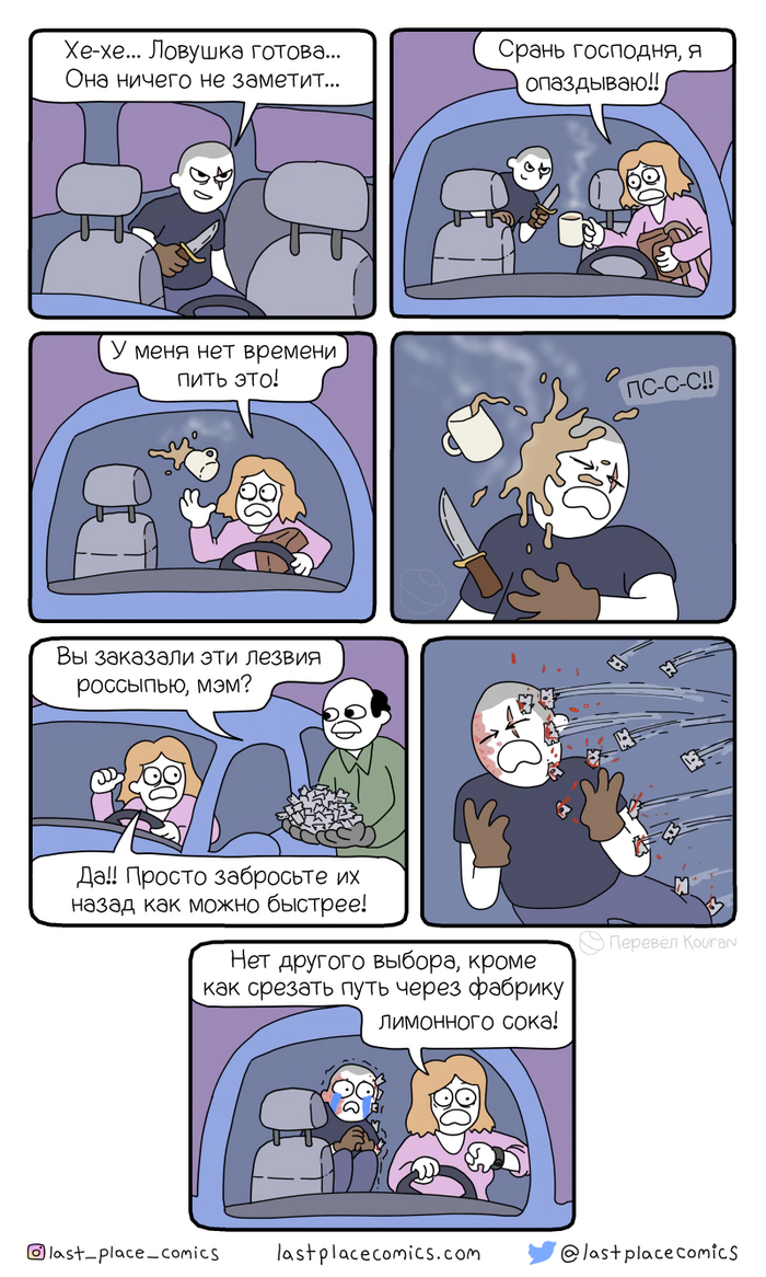 Если вы любите абсурдные истории, то комиксы Last Place (Последнее место) вам придутся по вкусу. Рисованные истории настолько бессмысленны, что на них нельзя смотреть без смеха. Смысл названия «Последнее Место» Название серии комиксов Last Place переводится как «Последнее Место». Сами комиксы абсурдны и комически бессмысленны, но в название смысл заложен. Название означает, что сборник этих комиксов — последнее место на Земле, где можно найти хоть какой-нибудь смысл. Поэтому, открывая историю из цикла Last Place, будьте готовы к полнейшему абсурду и смешной бессмыслице. Зак Кранор, автор Последнего Места, характеризует свои истории как глупые комиксы, в которые все всегда плохо. Практически каждый комикс заканчивается тем, что кто-то плачет, вопит или в отчаянии рвет на себе волосы. Зак предупреждает — не воспринимайте эти истории слишком серьезно, тогда они не станут поводом для депрессии. Когда-то, много лет тому назад Зак начал рисовать и публиковать забавную бессмыслицу, чтобы раз