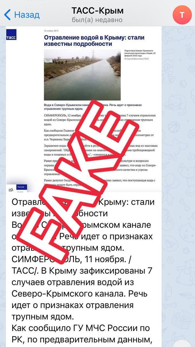Утром 14 ноября посредством поддельного аккаунта киевское ЦИПСо начала разгонять фейк об отравлении воды в Северо-Крымском канале "трупным ядом".