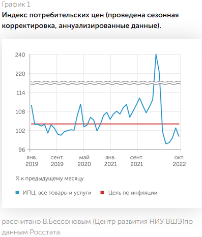 Хорошая статья на портале "Эксперт". Краткие выдержки Потребительские цены в октябре выросли на 0,18% к предыдущему месяцу и на 12,6% — к октябрю прошлого года, сообщил Росстат. Годовая инфляция продолжает медленно снижаться: в сентябре прирост год к году составлял 13,7% (например за тот же период в Англии 10,7%). При этом денежное расширение активизируется. Темпы прироста широкого денежного агрегата М2 в номинальном выражении увеличиваются все последние 12 месяцев: с 8% годовых в октябре прошлого года до 24% в сентябре 2022-го. Годовой темп прироста М2 в реальном выражении в сентябре увеличился до 9% после роста на 7,3% в августе. Близкую динамику реальной денежной массы мы наблюдали в последний раз только в конце 2020 года. Прокомментировать «Эксперту» ситуацию с ценами и денежными агрегатами согласился Владимир Бессонов, начальник отдела анализа отраслей реального сектора и внешней торговли института «Центр развития» НИУ ВШЭ: Текущие тенденции российской инфляции иллюстрирует график