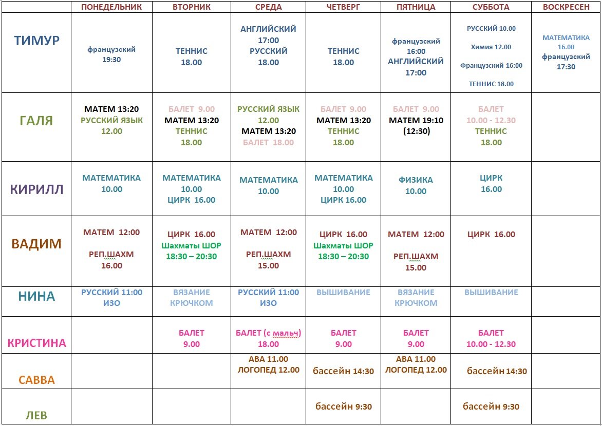Вот так сейчас выглядит расписание дополнительных занятий наших детей. Восьми из десяти, так как старшая уже работает, а младший ещё слишком маленький. В сентябре я планировала меньше занятий на этот год, но в процессе жизни пришлось кое-что поменять и добавить.