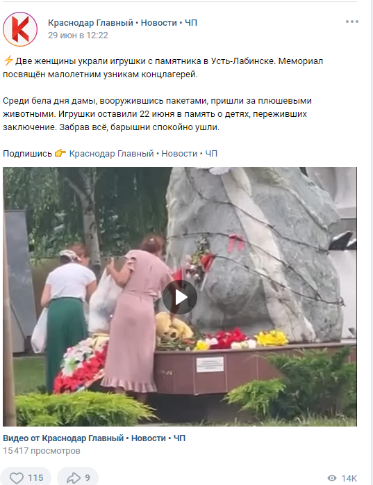 В конце июня этого года краевые СМИ сообщили об инциденте, который произошёл в городе Усть-Лабинске: 22 июня состоялась торжественная церемония возложения цветов к памятнику детям – жертвам концлагерей. Через некоторое время к памятнику подошли две дамы, собрали цветы и пошли дальше, однако были задержаны сотрудниками полиции. Пишут, что им вменяют хищение.