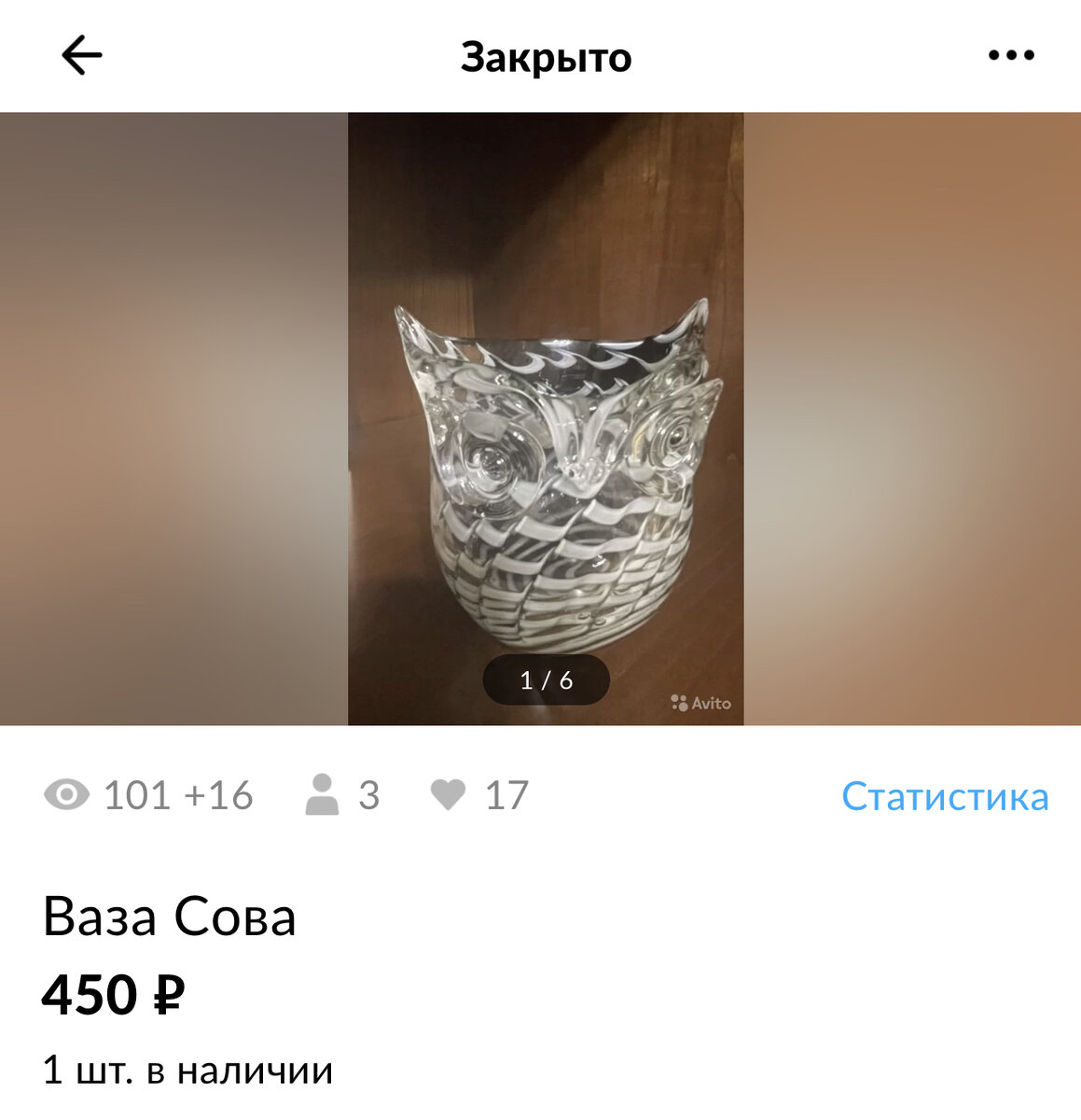 Так, лирическое отступление закончено, вернёмся к нашим баранам, то есть продажам . Вчера , ещё в поездке договорилась о продаже вазы Сова. Нашла ее при разборе шкафа в бывшей детской комнате. Лежала с игрушками . Откуда она у нас🤷♀️, ума не приложу. Возможно дочка, когда была маленькая откуда то из гостей притащила, была у неё такая манера, в гостях подарки выпрашивать. Или бабушка ей покупала, чего она только ей не покупала, какой ненужной ерунды. Все, у кого растут маленькие дети, знают , сколько всякого хлама покупается по просьбе любимых чадушек 😉 . Потому что ваза небольшая , я б такую не купила, нефункциональная она для меня. Если бы я не занималась продажами бэушных вещей, то при уборке шкафа эта вещь пошла бы на выброс. Однозначно. А так я, поразмыслив , решила, что есть коллекционеры, собирающие все по какой-то тематике. А значит кто то собирает и совушек. И выставила ее на продажу. И очень правильно сделала. За 7 дней я ее продала. 3 запроса было по данному объявления, один из них на Авито- доставку, я выбрала покупательницу из своего города, мне так удобнее , она сегодня приехала на работу и забрала.