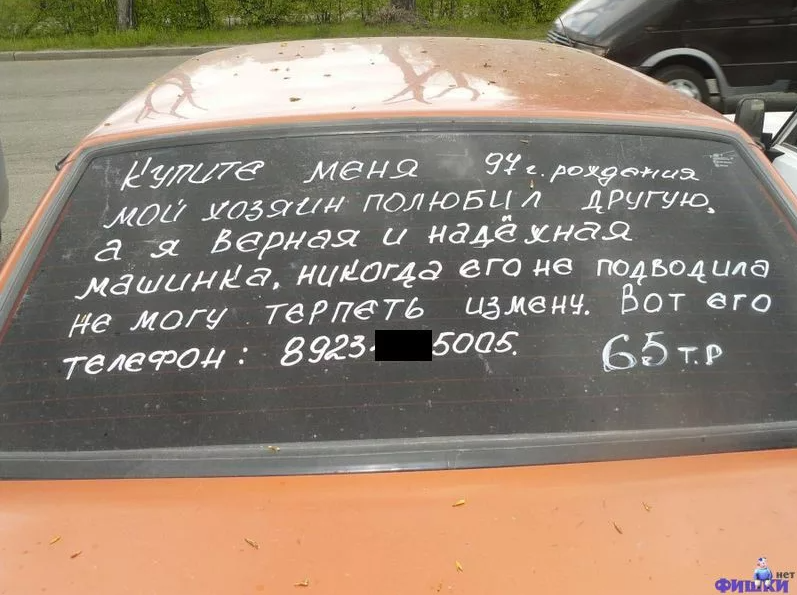 1. Тот самый случай, когда решил избавиться от своей «бывшей», но она так тебя любит, что просто нацарапала на заднем стекле вот такое душераздирающее объявление. Ну, как её после этого продавать? 2. Далеко не все таксисты могут написать бешеной с одной Н. А вот если что-то там отвалится, то скорее всего, другие водители в сегодня просто разживутся подержанными запчастями от настоящего «японца». 3. Когда живёшь в Тюмени, и очень спешишь, то ты явно упускаешь из вида третью беду на краю проезжей части: обочечников, которые шпарят, как улитки по левой полосе! 4. Когда стал владельцем такого достояния, как первый Солярис, то это уже не просто доказательство о течении времени, а настоящая машина времени, и никак иначе! 5. Всем тонированным и «посаженным» с таким заговором теперь ну точно можно не опасаться ни ям, ни люков открытых, ни гаишников внимательных на дорогах. Всё будет чётко! 6. Какие плюсы управлять Ладой Самарой? Да, собственно, почти никаких, кроме того, что женщин не бер
