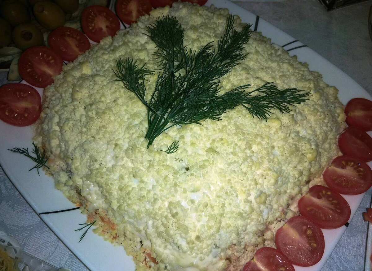 Правда-правда, если мамочка подаст папе такой вкусненький салатик, то у папы будет великолепное настроение) Самые простые продукты помогут сделать салат вкусным, аппетитным и довольно сытным. А нужно всего-то для этого приготовить: 500 гр печени 2 соленых или маринованных огурца 2-3 картошки 4 яйца 1 морковь 1 луковица Майонез, соль, веточка укропв Совершаем следующие шаги: 1.Отварить печень в подсоленной воде, остудить и натереть на крупной терке. 2.Картофель и яйца тоже отварить, остудить. Белки и желтки разделить отделить. Белки натереть на крупной терке, а желтки на мелкой. Картофель натереть на крупной терке. 3. Морковь на терке и лук кубиками обжарить на сковороде с 2-3 столовыми ложками растительного масла, остудить. 4.Берем разъемное кольцо и собираем салат послойно. Или я на этот раз собирала на квадратном блюде. Первый слой будет из натертого картофеля. Слегка присолить и сделать сеточку из майонеза. 5.Вторым слоем пойдет натертая на крупной терке отварная печень. Не забывае