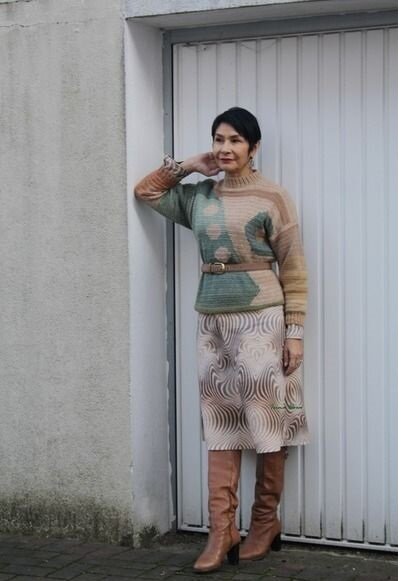 - Интересный джемпер, неяркий, но с необычным узором в стиле абстракции. Такой джемпер хорошо будет смотреться и с джинсами, и юбкой, но в данном примере его надели поверх платья с оригинальным принтом. Талия подчеркнута при помощи кожаного ремня коричневого цвета. Образ дополняют высокие светло-коричневые сапоги.