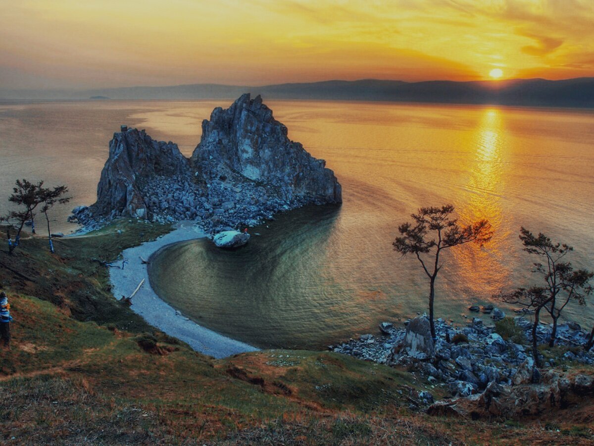 На Байкале есть остров Ольхон, а там – ряд достопримечательностей, среди которых выделяется так называемая Шаманская скала, она же Скала Шаманка, находящаяся на мысе Бурхан. Говорят, что здесь в своё время были найдены наскальные рисунки и даже надписи на санскрите – но их уже нет. Считается, что когда-то давно здесь даже приносили жертвы некоему духу, хозяину Ольхона – местные жители были уверены, что он живёт в пещере, которая есть в Шаманской скале. А рядом с мысом – священная роща, где сжигали и хоронили шаманов. Ещё здесь можно увидеть знаменитые 13 сэргэ – это коновязь, столбы, изначально предназначенные именно для привязки лошадей. Однако конкретно сэргэ – это гораздо больше, поскольку считается, что установка такого знака означает, что в этом месте кто-то живёт. Раньше сэргэ ставили у каждой юрты, чтоб показать, что род, живущий здесь, продолжается. Наличие именно 13 сэргэ не случайно, они установлены как символ 13 хатов (это сыны небожителей по местным поверьям), а Хан Хутэ-Ба