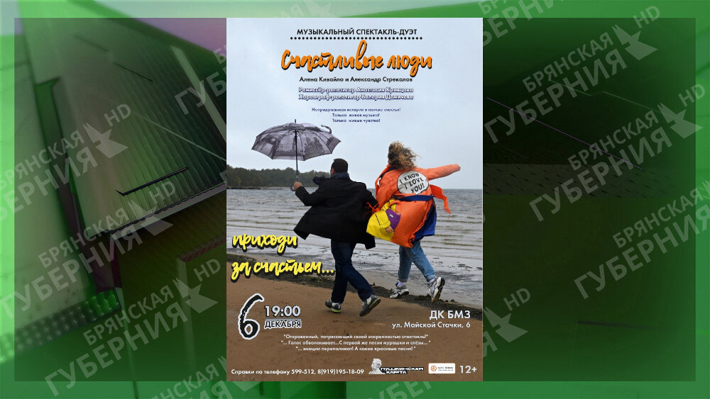 После успеха в Орле, где состоялся премьерный показ музыкального спектакля «Счастливые люди», настал черед увидеть его и брянской публике. Его представят 6 декабря в 19 часов на сцене Дворца культуры БМЗ Брянского областного методического центра «Народное творчество». «Счастливые люди» — это встреча двух творческих людей, композитора и поэтессы, аккомпаниатора и певицы Александра Стрекалова и Алёны Кивайло. В спектакле прозвучат 14 песен, написанных этим необычным дуэтом. За основу постановки была взята реальная история жизни актрисы. Авторы спектакля приглашают брянскую публику вместе попытаться ответить на вопросы, что же такое женское счастье, чем оно отличается от мужского, кто такие счастливые люди. Билеты продаются в кассе Брянского областного методического центра «Народное творчество» или на сайте. Приобрести билеты можно также в рамках проекта «Пушкинская карта». Справки по телефону 599-512, 8(919)195-18-09, дополнительная информация на официальном сайте www.nartwor.ru. Для спр