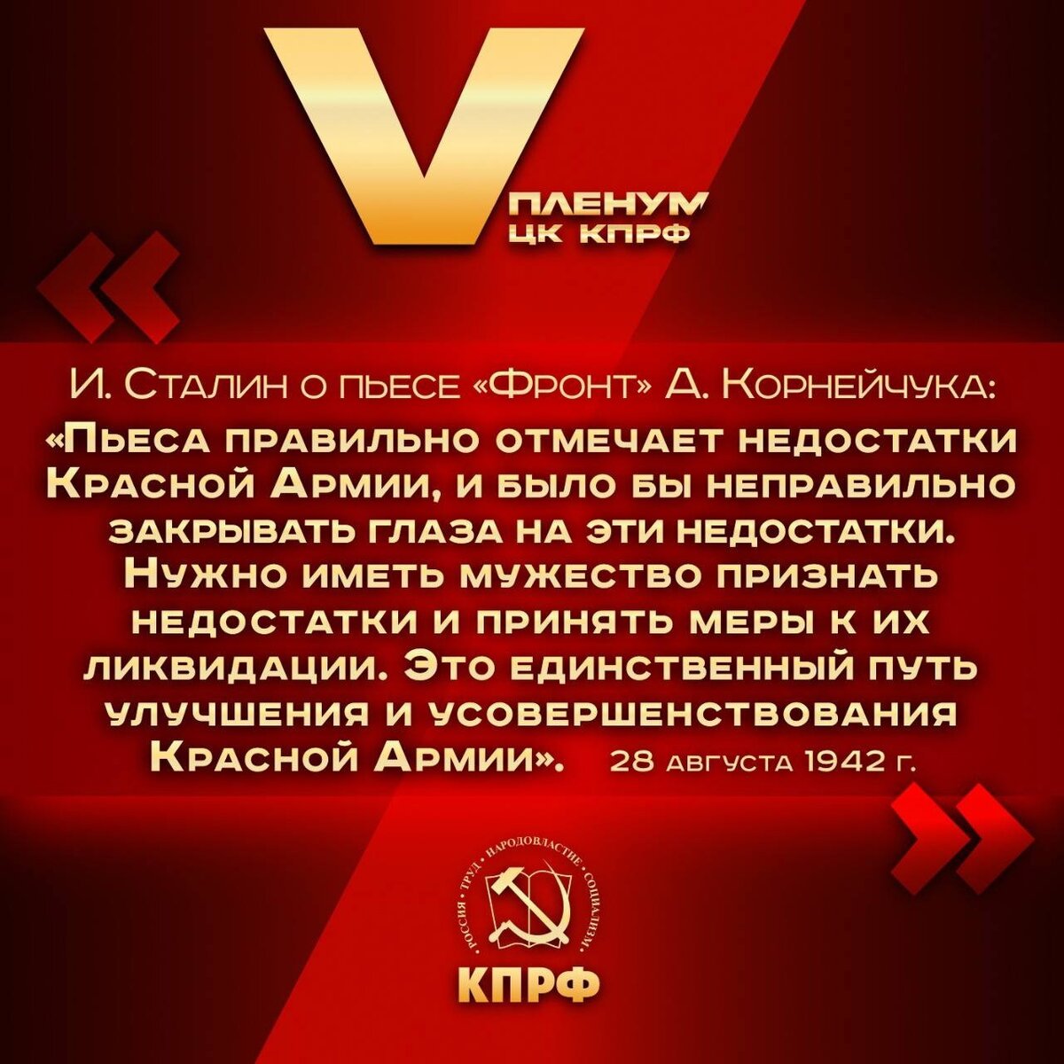 В годы Великой Отечественной войны наш народ пережил множество испытаний. В тот момент, когда Харьковская операция завершилась огромными потерями Красной Армии, немцы овладели Ростовом и Воронежем, рвались к Волге и на Северный Кавказ, появилась пьеса А.Корнейчука «Фронт». Она отразила трагические события 1942 г. В ней говорилось о трудностях и недостатках, некомпетентности руководства и устарелых подходах к ведению войны.