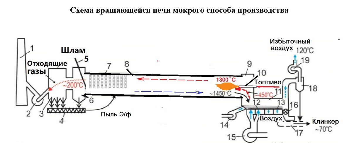 Вращающаяся печь работает по принципу противотока - материала и горячих газов движутся навстречу друг другу. Выделяют горячий и холодный конец печи. Холодный конец печи 8 приподнят и входит в пыльную камеру 6, с торца печи по шламопроводу 5 подается жидкий сырьевой шлам. С горячего конца по форсунке 10 подается топливо, которое сжигается непосредственно в печи. При вращении материал продвигается по печи от холодного конца к горячему. Горячие газы после сжигания топлива носят название отходящие газы, за счет создания разряжения дымососом 2 в пространстве печи продвигаются с горячего конца в холодный конец.