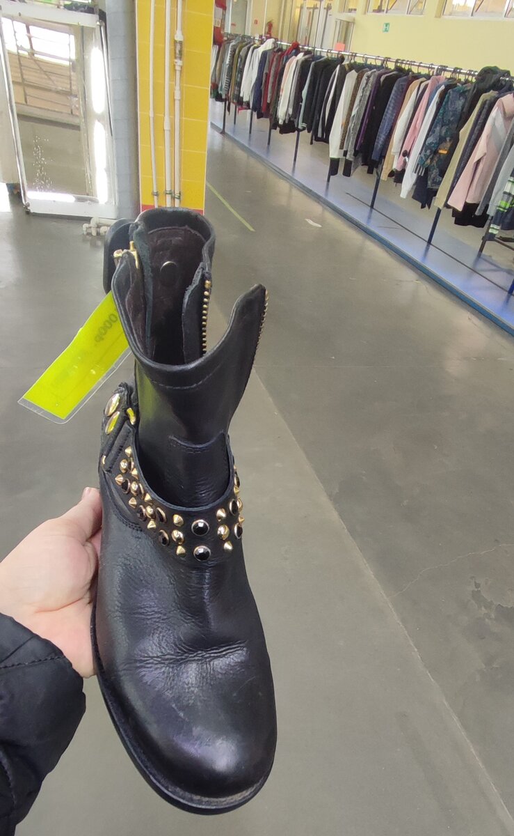 Если с сумками в Зигзаге стало гораздо хуже, обувь из натуральной кожи неплохая, хотя цены подросли. Демисезонные полусапожки Karlo Pazolini за 1000р, 37 размер, состояние очень хорошее, немного перебор с металлическими деталями Бежевые полусапожки на высоком тонком каблуке, остромысые, нарядные, цена 1500р, 39 размер, практически новые Челси в хорошем состоянии, только заломы от транспортировки в мешках российского производства TJ collection, цена 1000р, 36 размер Новые спортивные туфли из натуральной кожи 38 размера за 1000р Понравились лоферы с перебором декора, тут и меховушка, тут и крупные стразы. Состояние отличное, цена 2000р, 36 размер Вот прекрасные туфли из натуральной кожи за 1500р 37 размера Серые замшевые сапожки с остры мысом, внутри натуральная кожа, цена 1000р. Состояние отличное, нравится широкое присборенное голенище, 37 размер Эта не вся понравившаяся обувь, остальную покажу в следующем обзоре. Как видите, обувь есть, тем более я была в секонде на другой день
