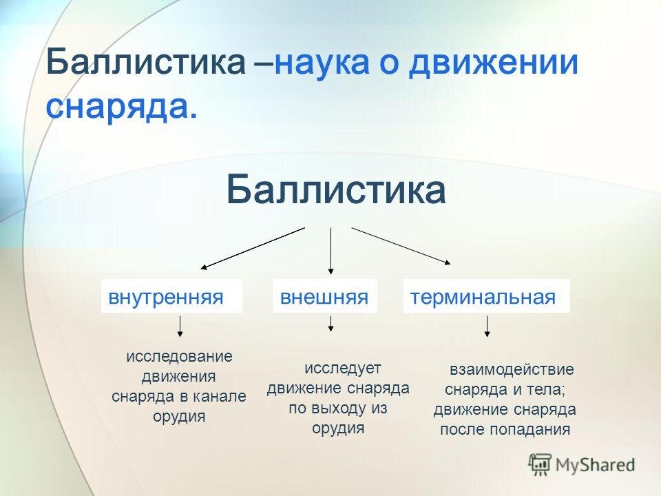 Баллистика (от греч. βάλλειν — бросать) — наука о движении тел, брошенных в пространстве, основанная на математике и физике. Она занимается, главным образом, исследованием движения снарядов, выпущенных из огнестрельного оружия, ракетных снарядов и баллистических ракет. Различают внутреннюю баллистику, занимающуюся исследованием движения снаряда в канале орудия, в противоположность внешней баллистике, исследующей движение снаряда по выходу из орудия. Под внешней баллистикой понимают, как правило, науку о движении тел в воздушном и безвоздушном пространстве под действием только внешних сил. Слово «внешний» в данном термине происходит от рассмотрения движения артиллерийского снаряда вне орудийного ствола. Существует также понятие терминальной (конечной) баллистики, имеющий отношение к взаимодействию снаряда и тела, в которое он попадает, и движению снаряда после попадания. Терминальной баллистикой занимаются оружейники-специалисты по снарядам и пулям, прочнисты и другие специалисты по