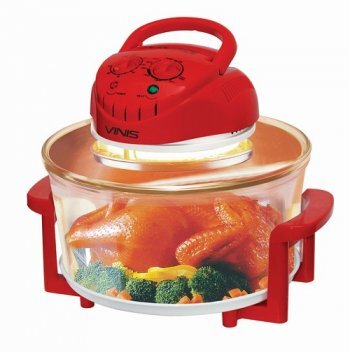 Перед тем как начать выбирать аэрогриль, нужно знать, что из себя этот прибор представляет, и понимать принцип его работы. По своему внешнему виду аэрогриль, представлен в виде прозрачной цилиндрической емкости изготовленной из термоустойчивого стекла, которая установлена на специальной пластиковой подставке, которая защищает поверхность стола от воздействия работающего горячего прибора. Аэрогриль сверху закрывается массивной крышкой, которая имеет вес два с половиной килограмма. Такой вес получился вследствие расположения сверху крышки пульта управления устройством, а с нижней части крышки крепятся вентилятор и нагревательный прибор.