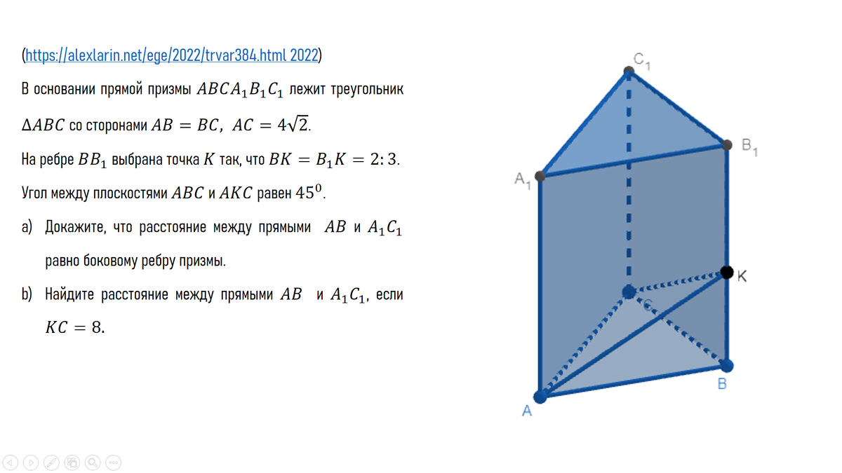 По определению расстоянием между скрещивающимися прямыми a и b называется длина их общего перпендикуляра d, заключенного между точками пересечения с a и b. Рассмотрим задачу II-ой части ЕГЭ по профильной математике, в которой удобно воспользоваться определением для поиска расстояния между двумя скрещивающимися прямыми. Для доказательства п. a) достаточно доказать, что боковое ребро перпендикулярно скрещивающимся прямым AB и A_1C_1. Так как ребро AA_1 пересекается с AB и A_1C_1, то именно перпендикулярность его и докажем. Так как боковые ребра прямой призмы параллельны и равны, то AA_1=BB_1. Удобнее искать BB_1, так как ему принадлежит точка K. Обзор идей поиска расстояния между скрещивающимися прямыми можно найти здесь https://dzen.ru/video/watch/636e13d15e02fd50d4ba960f