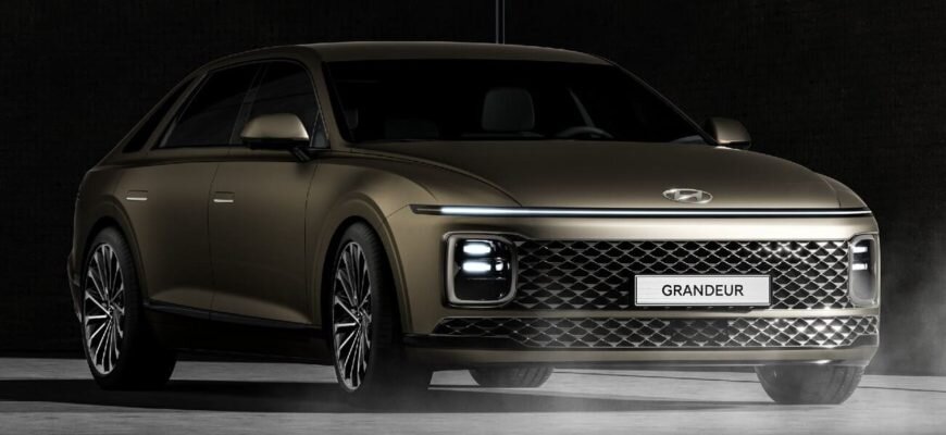 Обзор. Как и предшественники, новый Grandeur построен на переднеприводной архитектуре с поперечным расположением двигателя. Новинка получила необычный внешний вид с безрамочной решеткой радиатора прямоугольной формы, двухъярусной передней оптикой, тонкой полосой ходовых огней. Среди особенностей дизайна также можно отметить необычное оформление бокового окна на задней стойке кузова, безрамочные двери, выдвигающиеся ручки и 20-дюймовые колёсные диски с эксклюзивным рисунком. Технические характеристики. Пока состав линейки силовых агрегатов автомобиля не раскрыт. Вероятнее всего, новый Grandeur 2023 будет доступен с бензиновыми двигателями объемом 2,5 или 3,5 литра, либо 3,5-литровым битопливным агрегатом (бензин + пропан-бутан), либо гибридной установкой, состоящей из 1,6-литрового бензинового турбированного мотора и электродвигателя. Салон. При отделке интерьера нового Hyundai Grandeur 2023 применяются высококачественные экологичные материалы, в том числе алюминий, дерево и кожа Nappa