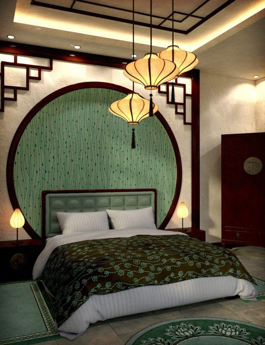 Стены. В зависимости от задачи спальни, выбирают цветовую гамму: для ощущения власти и богатства — черный с золотом; для активности и пробуждения внутренней энергии — красный; для расслабления и отдыха — бежевый; успокоиться поможет голубой, а поднять настроение — зеленый. Что касается отделочных материалов, стены оклеивают бамбуковыми обоями с нанесенным рисунком или фактурой растений. Аналогично поступают с шелковыми или виниловыми обоями с геометрическими орнаментами или китайской росписью. Часто используются в дизайне фотообои с изображением гейш, мудрецов, цветущей сакурой или поединками борцов. Часть стены оформляют деревянными панелями, которые окрашены в красный цвет.