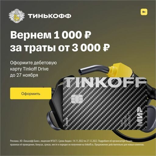 ОФОРМИТЕ-ОНЛАЙН КАРТУ(ТЫК) DRIVE1000 ПРОМОКОД. Начислим 1000 рублей за покупки от 3000 рублей. у Участника Акции на момент участия в Акции не заключен и ранее в течение года не заключался Договор ДАННОЙ карты. 1000 ₽ублей при тратах 3000 ₽уб. в первые 30 дней + 5% штраф ГИБДД, АвтоУслуги + 10% кешбэк АЗС, ОСАГО, КАСКА + 1 % кешбэк на Покупки за БЕСПЛАТНУЮ Дебетовую карту Тинькофф Drive оформите 2023 г. + Бесплатная доставка ПО ССЫЛКИ https://vk.cc/ciDjE0 Обслуживание от 0 ₽ При остатке в сумме от 50 000 ₽ на карте, накопительных счетах, вкладах, в инвестициях. Иначе — 99 ₽/мес. Или карта будет бесплатной при наличии подписки Тинькофф PRO ПО ССЫЛКИ https://www.tinkoff.ru/sl/56atYG9QXqn или Tinkoff Premium. ПО ССЫЛКИ https://www.tinkoff.ru/sl/rmp05vAQTf для новых и у кого 1 год была закрыта эта карта(включая счет) клиентов 1000 ₽ КЕШБЭК за покупки по дебетовой карте. Оформите Tinkoff Drive , совершите покупки на сумму от 3000 ₽ в течение месяца и получите кэшбэк. 10% кешбэк бонусами за