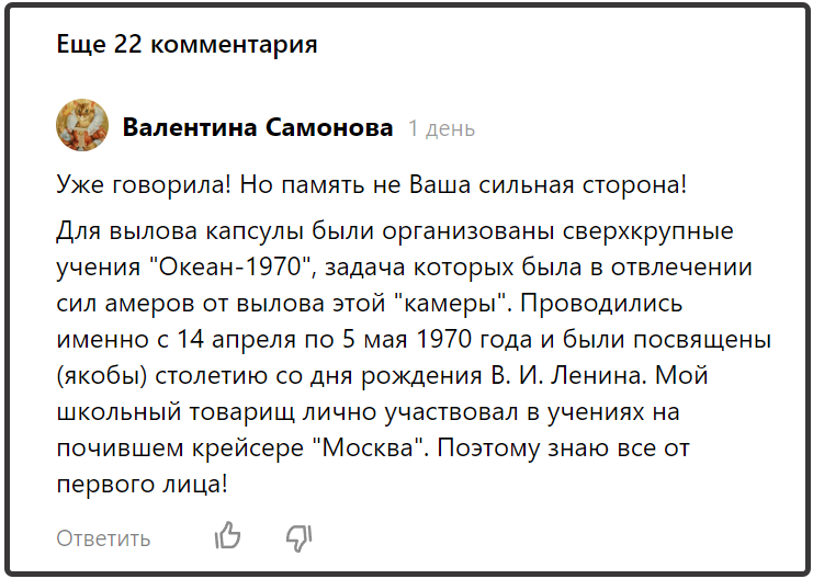 Владимир Щелоков (aka ИВАН ИВАНОВ, Надежда Кузнецова, Анастасия Филипповна... Валентина Самонова) пишет: Это, как вы понимаете, связано с темой вылова злополучной болванки командного модуля в Атлантике. Конспирологи всячески пытаются доказать, что в СССР с целью вылова космического корабля Аполлон-13 были организованы целые военно-морские учения! В которых принимал участие ... почивший крейсер "Москва". И на этом крейсере принимал участие школьный товарищ нового читателя Валентины Самоновой (Владимира Щелокова). Почивший крейсер, надо полагать, это тот самый, что пошел на дно в ходе СВО на Украине. А теперь открываем Википедию и смотрим, когда был спущен на воду этот крейсер. Прочитали? Теперь понимаете, почему я не сомневаюсь в том, что Самонова не кто иной как тот самый Щелоков.