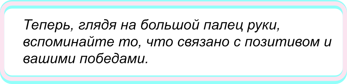 Для тех, кто, пока все паникуют, накапливает потенциал, знания и опыт — для вас, мудрейшие — я приготовила 5 правил роста, которые помогут каждый день делать шаг к своей цели. Назовём их «правилами на пальцах» и сделаем упражнения, чтобы их запомнить. А ладонь будет напоминанием, которое всегда при вас. 1. Покажите «класс» 👍 Первое правило связано с позитивом. Пока наш многострадальный мозг формировался, ему через многое пришлось пройти. Это сейчас мы можем заказать еду в «Самокате» и наблюдать за грозой из окна уютной квартиры. А раньше за ужин надо было сразиться с диким зверем, а молния могла прилететь прямо в лоб. Мозг учился через страх. Потом он привык бояться и концентрироваться на негативе, хотя в этом нет острой необходимости. Именно поэтому мы чаще вспоминаем падения, а триумфы быстро забываются. Верните внимание к руке, посмотрите на «класс». Это поднимет настроение, даст энергию и силы двигаться вперёд. 2. Прежде, чем действовать, прицельтесь! Когда в детстве нам нужно