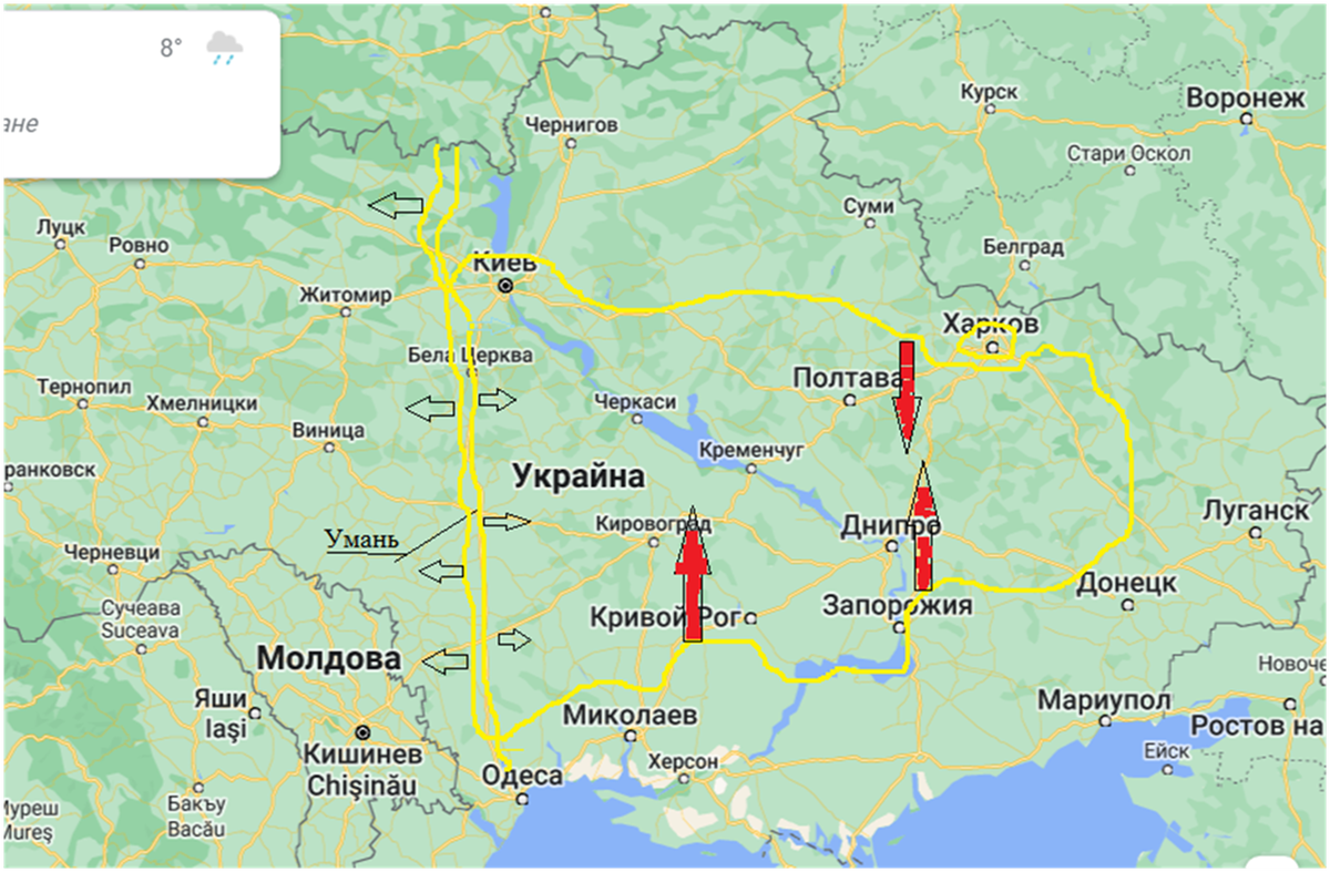 На этой огромной территории все войска ВСУ оказались бы в окружении, без возможности подвоза оружия извне, а запланированный плацдарм к западу от Донецка был бы завершен, и если бы они дошли, например, до Кременчуга, то появилась бы вторая группа, поджатая с востока к Днепру, и не успела бы дойти до АТО. А если бы что-то могло прийти с запада, то его пришлось бы уничтожить на пути к линии Киев-Одесса или на государственной границе, не говоря уже о железной дороге и мостах в этом направлении, а также о маршруте из Румынии через Рени и Измаил... Да, было бы много других проблем, и украинские бойцы могли бы слиться с почти 20-миллионным населением освобожденной Украины. Но не эти проблемы решают сейчас войска, с головой погружаясь в довольно сильно укрепленные позиции противника.