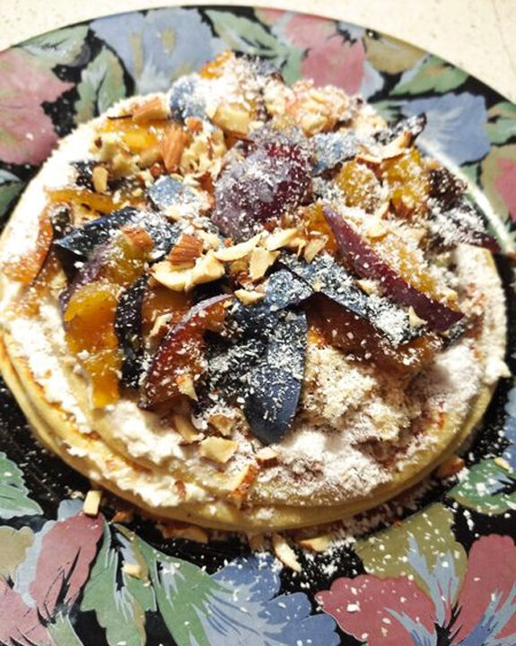 Этот «тортик» из кокосовой муки готовится быстро, получается очень нежным и вкусным Готовится на сковороде, как обычные блинчики. Тесто из кокосовой муки (у меня оставалось граммов 200) и столовой ложки изолята соевого белка (можно любой сухой белок), плюс 3 яйца, соль, подсластитель на ваш вкус. Тесто получается, как на блинчики. Крем - на основе творожного сыра. У меня - собственного приготовления из йогурта. В качестве добавки - кокосовая стружка, подсластитель. Каждый блинчик смазываю кремом и пересыпаю измельчённым миндалём, сверху – крем и любимые сливы. Сливы, если они твёрдые, можно потомить в кастрюльке, добавив при необходимости подсластителя. Сливы можно есть при сахарном диабете, но в ограниченных количествах. Они имеют низкий гликемический индекс (24). Желательно съедать после плотного сбалансированного завтрака или обеда, по 2-3 штуки. Больше общения и рецептов - в группе "Рецепты для диабетиков" в ВКонтакте! Рецепт на странице Автор рецепта – Галина Сасыкова