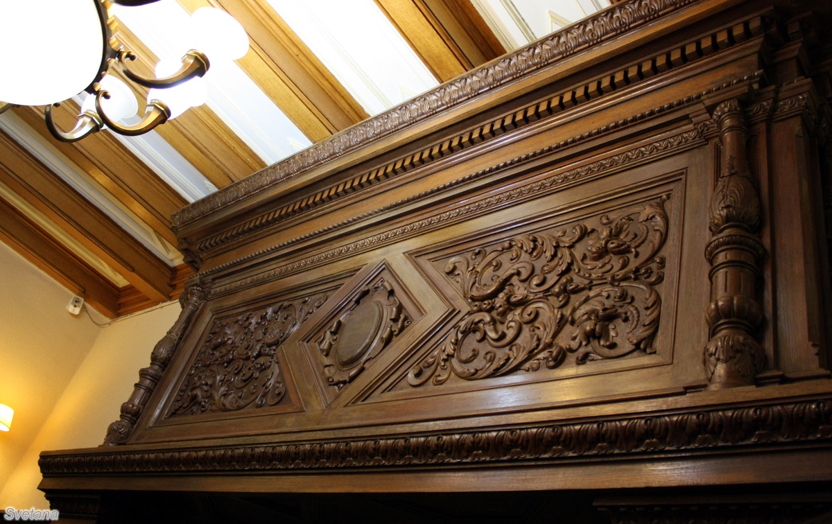В оформлении парадной столовой использованы элементы французской замковой архитектуры. Начало здесь: Предыдущая часть: Деревянная отделка камина выполнена из мореного дуба. Тонкая и изящная резьба по дереву не устаёт восхищать. Посредине столовой стоит стол с выставленным на нем обеденным фарфоровым сервизом. Сама столовая обрамлена в дубовые декоративные панели, на потолке можно рассмотреть первоначальную роспись. В интерьере сохранился изящный буфет и фарфоровый сервиз, выполненный на фабрике М.С. Кузнецова. Может быть эта фамилия ничего не скажет неискушённому читателю, но вот словосочетание "дулёвский фарфор" слышали многие. Стены оформлены дубовыми панелями с рельефной резьбой в форме листьев, плодов. На полках буфетов представлены фарфоровые изделия российских и немецких фабрик. На потолке деревянные балки имитируют перекрытия. Вдоль стен высокие панели и буфеты покрытые резьбой. В центре зала большой стол с богатым сервизом посуды того времени. Белая скатерть по бокам оформле