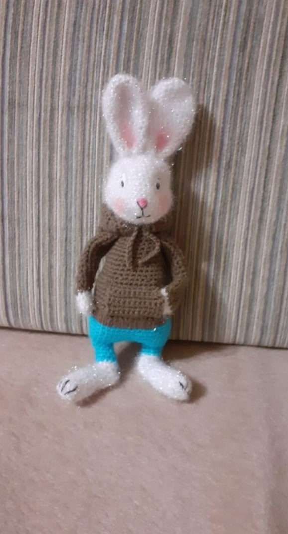Новый кролик! Материал - акриловая пряжа Одежда кролика - худи и штанишки (Цвет выбираете Вы) Тело кролика сделано из белой, блестящей пряжи. Приятных покупок 💗
