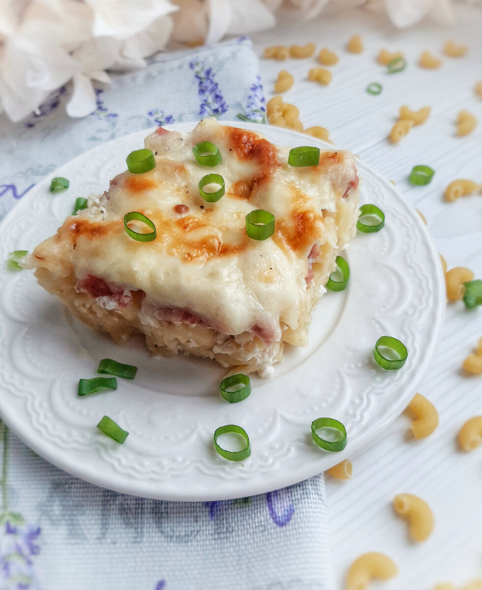 Сливочная запеканка из макарон с ветчиной и сыром.