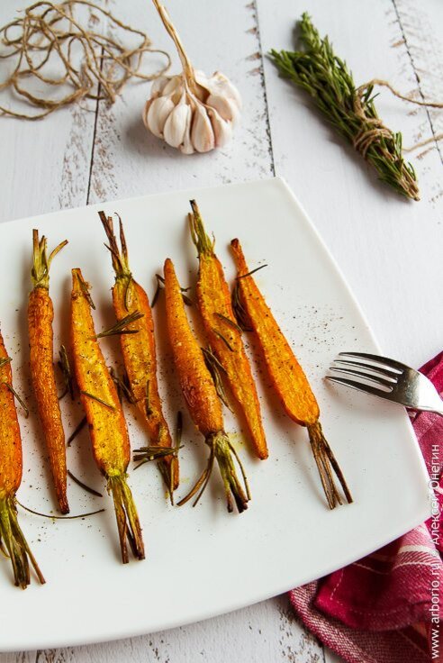 Способов запечь морковь в духовке существует множество. Этот — самый простой: по большому счёту, никаких осознанных действий, кроме сугубо косметических — но морковка в итоге получается на загляденье, точнее, на объеденье. Почему? Тому есть несколько причин. Во-первых, травы охотно сообщают свои ароматы маслу, а оно передаёт их запекающейся моркови. Во-вторых, в духовке морковь стремительно теряет влагу, а значит, её собственный вкус становится более концентрированным. В-третьих, под воздействием жара духовки сахара, которых в моркови с избытком, начинают карамелизироваться, что придает знакомому овощу новые оттенки вкуса. Главное же здесь то, что такая запечённая морковка — не только полезное, но и очень вкусное блюдо. Или гарнир, кому как нравится. Рецепт запечённой моркови в духовке Сложность