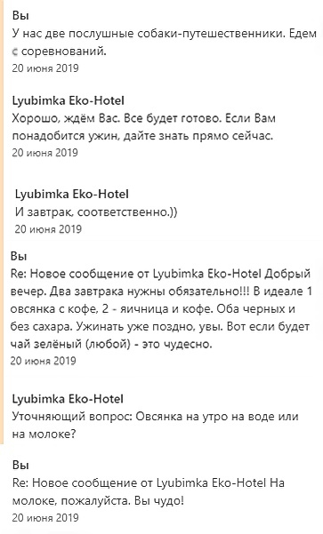 База отдыха на берегу Селигера всего в 8 километрах от Осташкова. Во всех отношениях приятное место с одним, но существенным недостатком, практически полным отсутствием связи с миром. Ближайший город к нужному нам месту на карте России - Осташков. Прибывали мы в него поздно, около полуночи, поэтому еще в дороге начали обзванивать отели, базы отдыха и гостевые дома. Скажем так: НАЙТИ РАЗМЕЩЕНИЕ С ПСАМИ В РАЙОНЕ СЕЛИГЕРА НЕ СЛОЖНО, СЛОЖНО НАЙТИ СВОБОДНЫЙ НОМЕР ЛЕТОМ! Модного словечка dog-friendly в эти места еще тоже не завезли отдыхающие мажоры. Но в Осташкове рады постояльцам и гостям с собаками, похоже, везде, независимо от стоимости и условий - и в отелях премиум класса, и на бюджетных демократичных базах. Не шутим! Успели пообщаться пока искали... Несказанно повезло, что «Любимка» в ночь с четверга на пятницу была свободна. Основной заезд - на выходные. На пустующей базе нас ждали администратор и его воспитаннейший хась. И это в ночи-то! Нашу переписку по дороге прилагаем, оцените!