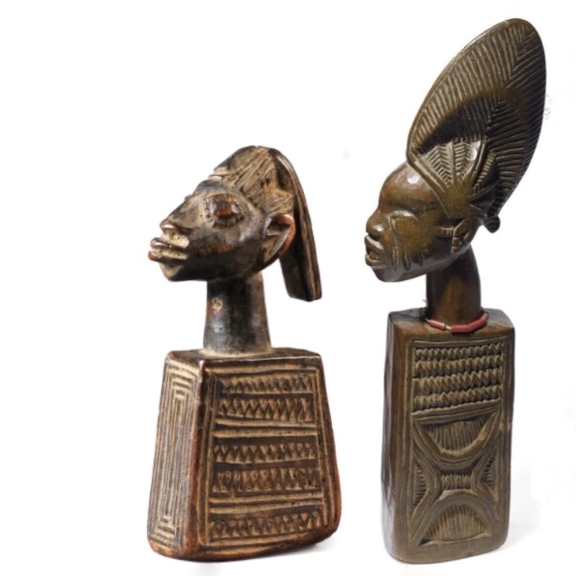 📍Нигерия: yoruba Крутым резчиком, выполняющим серьёзные ритуальные скульптуры, сразу не станешь. Так, в качестве первой ученической работы с деревом обычно вырезают omolangidi. Это означает «деревянный ребёнок», по сути, это кукла йоруба, игрушка для девочек. Такую фигурку девочки несут на спине, она удерживается на месте полотном ткани, ну и играют с ней. Помимо развлекательной функции такие фигурки вырезают по другим случаям: ▪️для обозначения abiku* Напомню, это слово означает «дети, рожденные, чтобы умереть», сюда относятся дети, которые умирают вскоре после рождения или до 12 лет. Этим же словом называют духа или духов, вызвавших смерть. ▪️в качестве замены памятных фигур Они представляют умерших близнецов ibeji*. Отличительных особенностей омолангиди несколько. Омолангиди всегда сделаны из дерева. Фигурки имеют цилиндрическую или прямоугольную форму тела и головы. Причем бывают натуралистические и более абстрактные. Куклы не имеют конечностей, после головы идёт пло