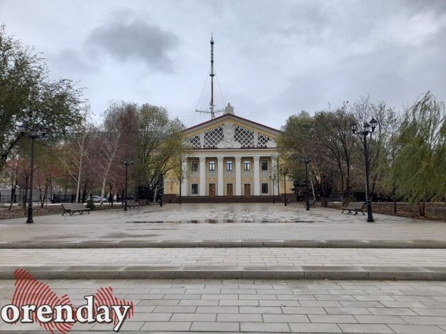 Вечером здание реконструированной оренбургской филармонии выглядит уныло