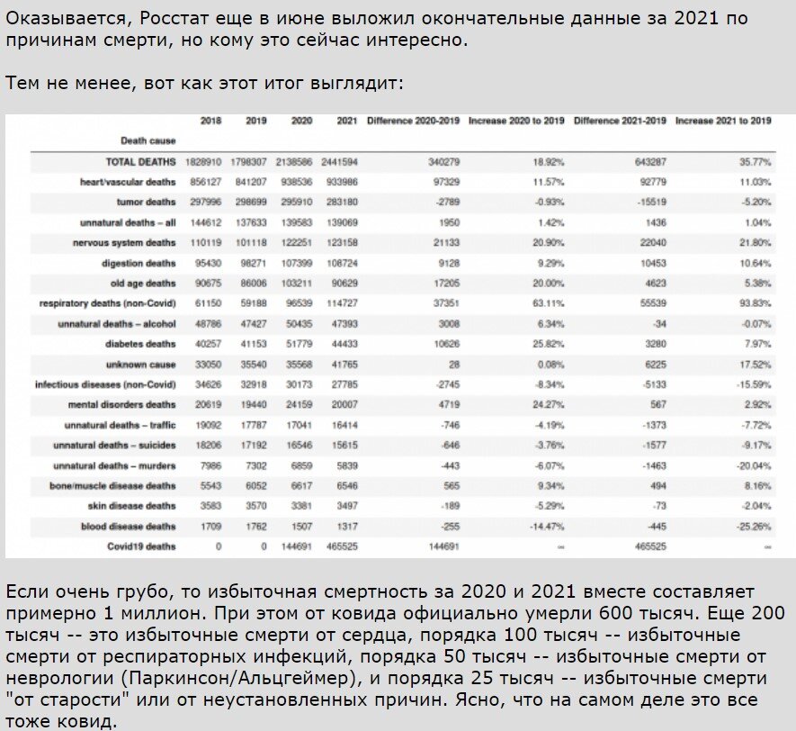 Отметим, что по данным Росстата на ковид приходится около 60% избыточной смертности, а по данным Роспотребнадзора (которые использовали СМИ) только треть.