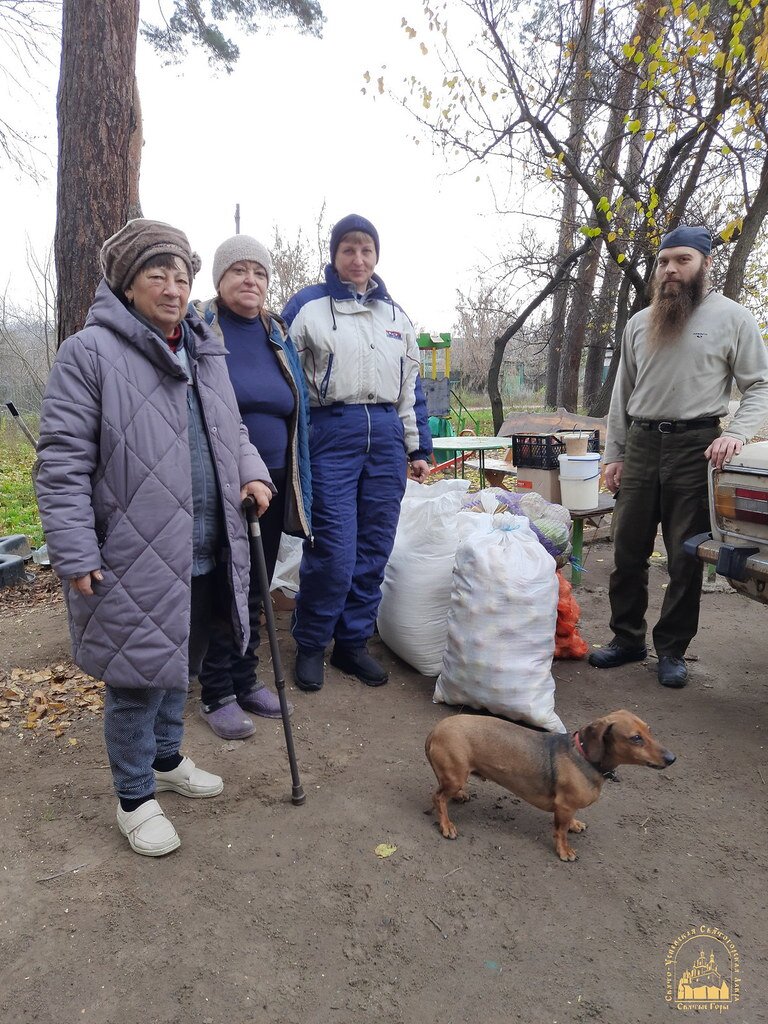 12 ноября братия Святогорской Лавры во главе с келарем обители монахом Сергием (Куприным) раздали гуманитарную помощь жителям города Святогорск. Продуктовые наборы получили 70 человек — в частности, жильцы домов по улицам Соборная и Камышева. Всего было роздано 350 килограмм картофеля, 70 килограмм капусты, 60 килограмм лука и столько же моркови, более 60 литров подсолнечного масла, два ящика мясных и два ящика рыбных консервов, два ящика печенья, 50 килограмм сахара. Сейчас в городе Святогорск частично отсутствуют электричество, вода, газ, нет работающих аптек и магазинов. Из 4000 жителей в городе осталось 650 человек. Люди выживают только благодаря гуманитарной помощи, которую привозят волонтёры. Как отметил монах Сергий, даже этой помощи не хватает. Особенно радуются люди овощам: луку, капусте, моркови. В некоторые семьи братия привозит помощь адресно. В большинстве случаев монахи просто подъезжают к домам и раздают помощь встретившимся святогорцам, а те позже делятся с