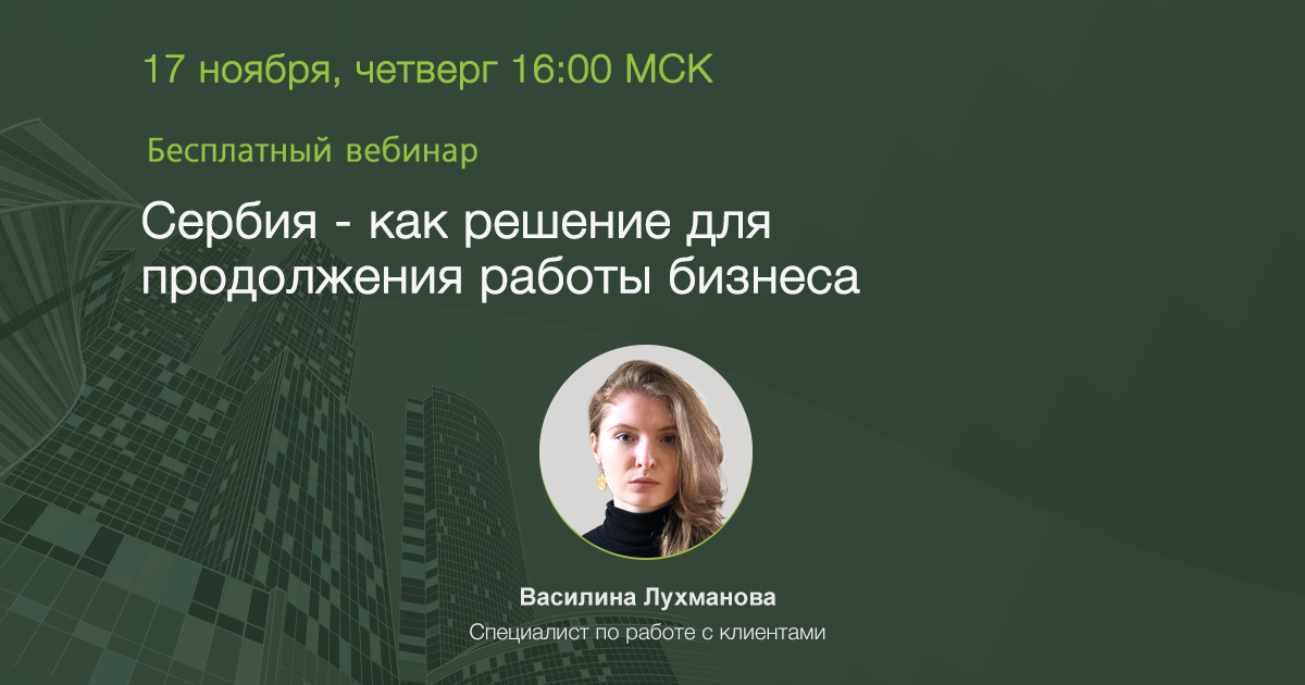 Приглашаем вас на вебинар, посвященный возможностям ведения бизнеса в условиях санкций через регистрацию компании и открытие счета в Сербии, а также получение сербского ВНЖ. На вебинаре мы разберем, почему на сегодняшний день именно Сербия является одной из подходящих юрисдикций для россиян, рассмотрим особенности и варианты регистрации сербских компаний, обсудим возможности, которые дает ВНЖ Сербии для продолжения работы вашего бизнеса и повышения качества жизни. Тема вебинара: Сербия - как решение для продолжения работы бизнеса Спикер: Василина Лухманова, Cпециалист по работе с клиентами