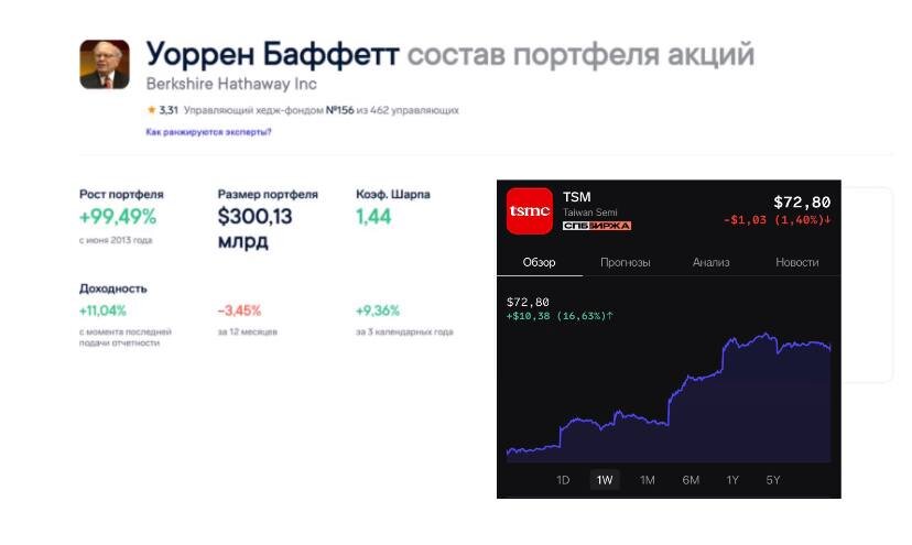 Это значительный шаг в технологический сектор со стороны Баффетта. Новость привела к росту акций тайваньской компании производящей чипы — TSMC (TSM) на Тайване во вторник более чем на 6%, так как она повысила настроения инвесторов в отношении компании. А ведь в прошлом месяце акции Taiwan Semiconductor достигли двухлетнего минимума из-за резкого замедления мирового спроса на чипы. ✅ Кстати, купить эти бумаги можно на СПБ Бирже, имея статус квалифицированного инвестора. А вы следите за покупками управляющих хедж-фондов? 👍 — да 👎 — нет #уорренбаффетт